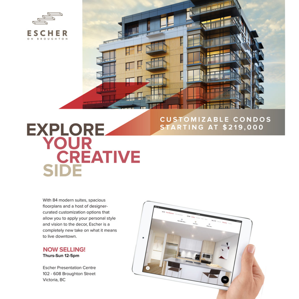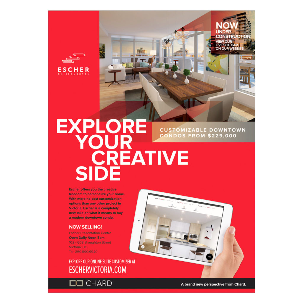 The Escher project was conceived to stand out amongst the crowd. The building was designed to push the boundaries of modern architecture in Victoria BC. This meant that the advertising was targeted at a special niche of creative people that were looking for the most customizable options on the market. We were hired by Chard to do advertising with an existing brand & ID.